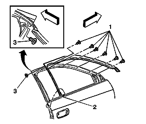 4. Remove the screws (1, 3) from the front door upper auxiliary molding.