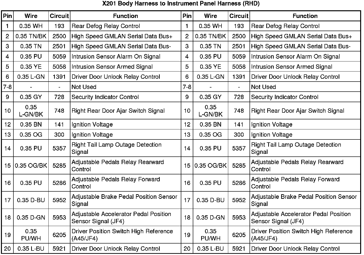 X201 Body Harness to Instrument Panel Harness (RHD)