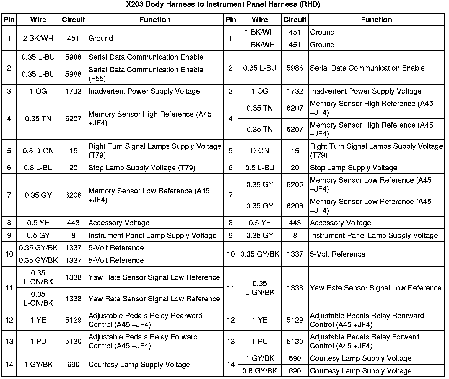 X203 Body Harness to Instrument Panel Harness (RHD)