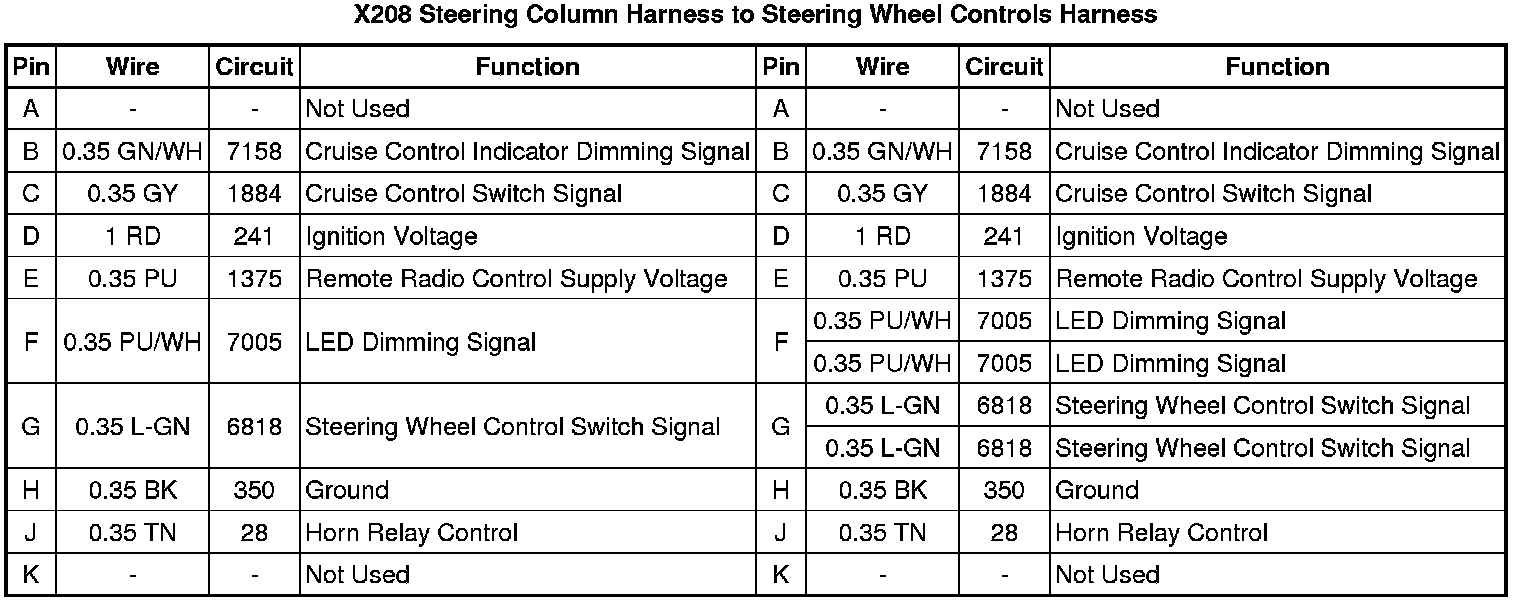 X208 Steering Column Harness to Steering Wheel Controls Harness