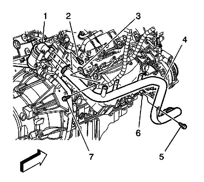 3. Install the coolant pipe (4), NEW seal, and fasteners (2 and 7). Refer to Engine Coolant Inlet Pipe Replacement (LY7 - Gas, 6 Cylinder, 3.6L, SFI, V6) (Service and Repair) .