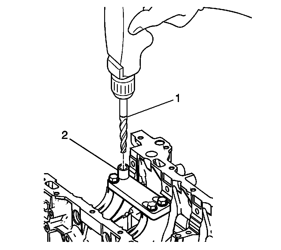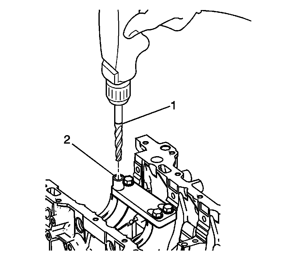 * Drill the crankshaft main bolt hole until the mark (1) on the drill aligns with the top of the drill bushing (2).