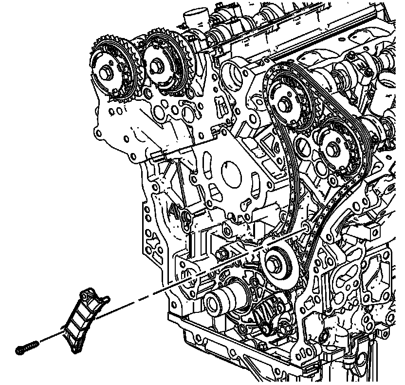 3. Remove the left bank secondary camshaft drive chain guide. 27. Secondary Timing Chain Guide Removal - Left Side