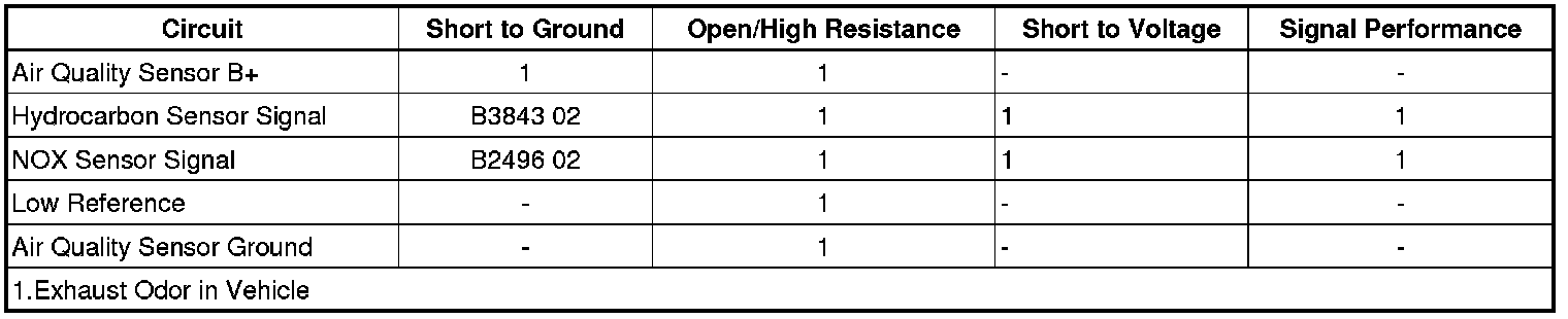 The HVAC control module monitors the outside air quality via the air quality sensor assembly while in AUTO mode. The air quality sensor is a 5-wire sensor, 1 ignition voltage circuit, 2 ground circuits and 2 signal circuits. There are 2 sensors inside the air quality sensor assembly. A hydro carbon (HC) sensor which is used for detecting gasoline exhaust fumes and a Nox sensor which is used for detecting nitrous of oxide. When high levels of hydro carbons (HC) are detected at the front of the vehicle the HC sensor resistance and signal voltage are low. When high levels of Nox are detected at the front of the vehicle the Nox sensor resistance and signal voltage are high.