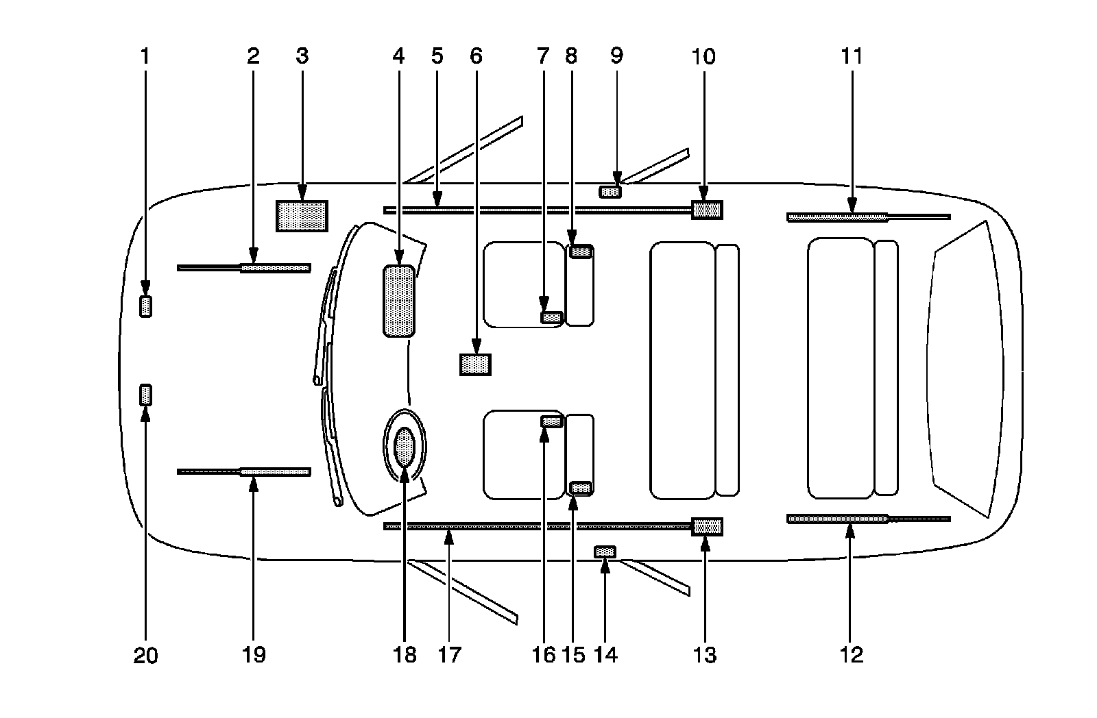 The SIR Identification Views shown below illustrate the approximate location of all SIR components available for the vehicle. This will assist in determining the appropriate SIR Disabling and Enabling for a given service procedure, refer to SIR Disabling and Enabling (Service and Repair) .