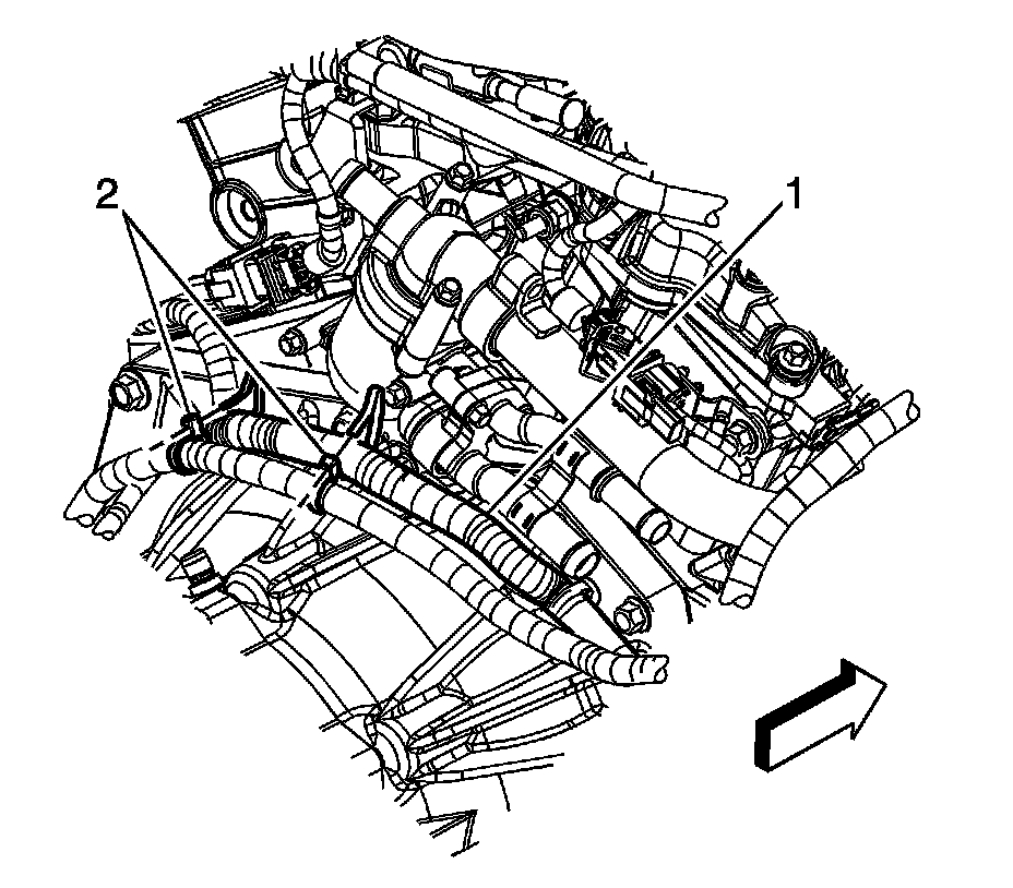 13. Install NEW tie straps (2) securing the positive battery cable to the engine wiring harness (1).