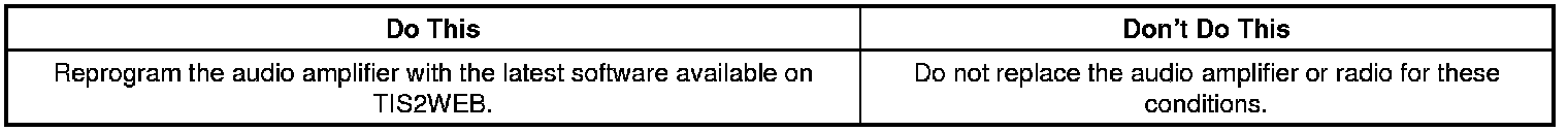 A revised calibration has been developed to address these conditions. Technicians are to reprogram the audio amplifier using TIS2WEB and selecting " Amplifier Software Update (RPO STZ or Y91 only)". Refer to the Audio Amplifier Programming and Setup procedure in SI for more information. As always, make sure your Tech 2(R) is updated with the latest software version.