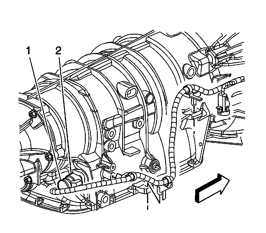 8. Disconnect the transmission wiring harness connector (1) from the transmission (2) by rotating the locking latch counterclockwise.