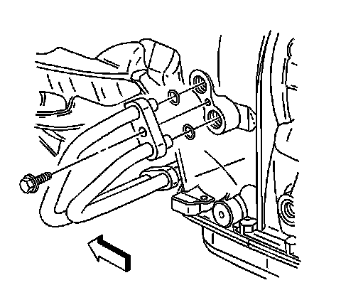 12. Remove the transmission fluid cooler pipes from the transmission, and position aside. Refer to Transmission Fluid Cooler Pipe Replacement - Rear (w/RWD) (Transmission Fluid Cooler Pipe Replacement - Rear (w/RWD))Transmission Fluid Cooler Pipe Replacement - Rear (w/AWD) (Transmission Fluid Cooler Pipe Replacement - Rear (w/AWD)) .
