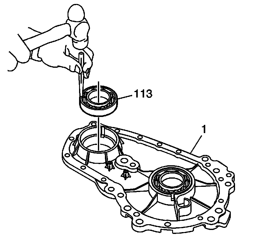 2. Install the front output shaft bearing (113) into the case (1).