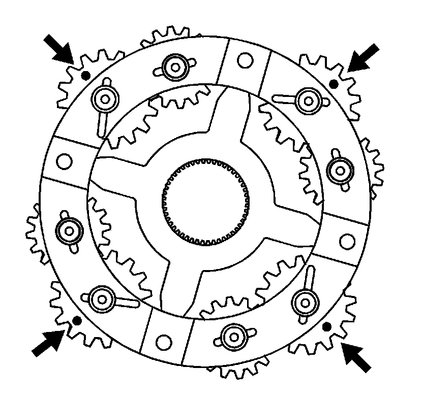 9. With the thrust washer side of the planetary differential facing down, align the marks on the pinion gears. Position the alignment marks with an area on the planetary differential that can be reference for all gears.