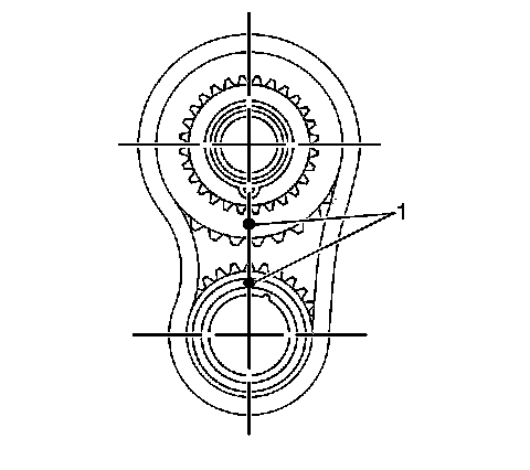 1. Align the timing marks (1) of the camshaft intermediate and crankshaft sprockets. The marks should be aligned vertically in the installed position.