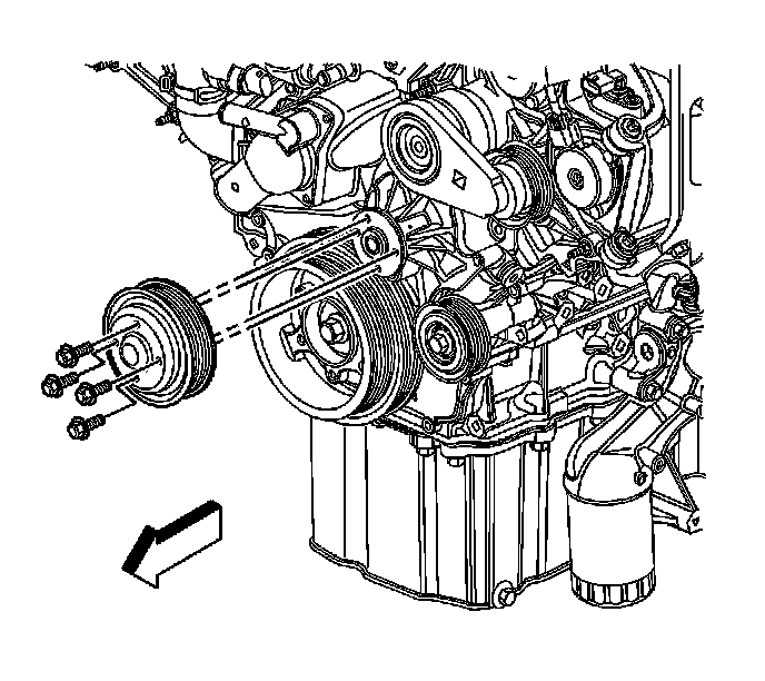 3. Remove the water pump drive belt. Refer to Water Pump and Air Conditioning Compressor and Power Steering Pump Belt Replacement (Water Pump and Air Conditioning Compressor and Power Steering Pump Belt Replacement) .