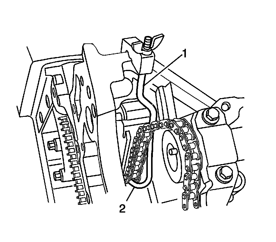 7. Insert the hook end (2) into a secondary timing chain link as shown.