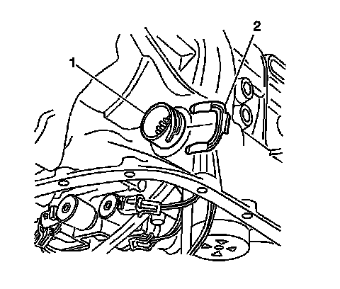 2. Disconnect the transmission wiring harness connector (1) from the transmission by rotating the locking latch (2) counterclockwise.