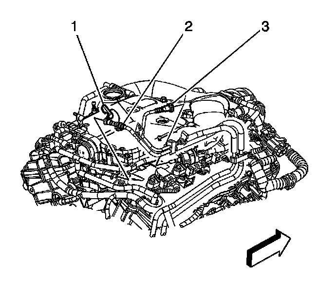 34. Disconnect the engine module wiring harness connectors (1-3) from the underhood electrical center. Refer to Underhood Electrical Center or Junction Block Replacement (Service and Repair) .