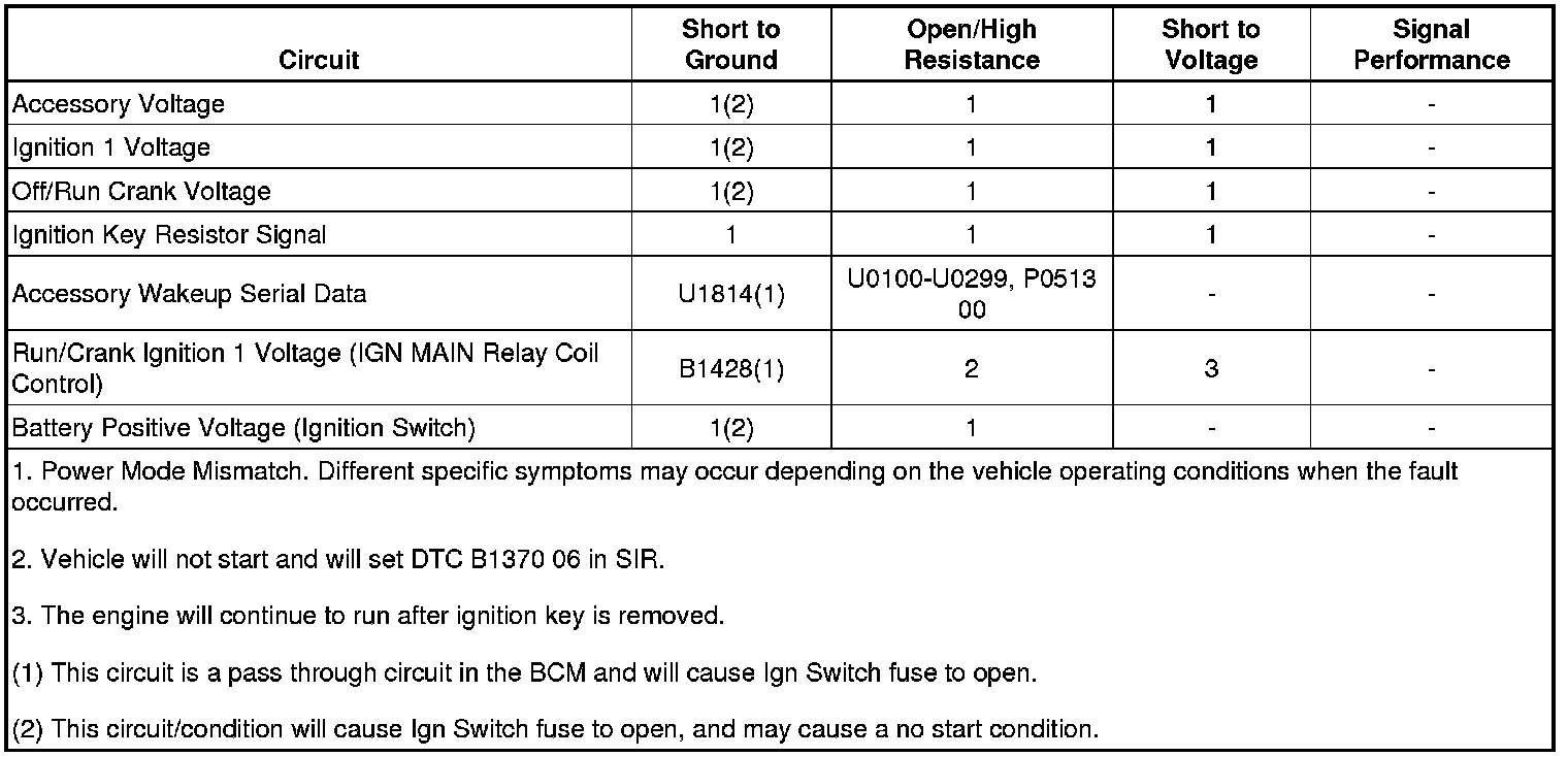 Some system functions may operate one time and not the next with a specific fault in the ignition switch circuits depending on the vehicle operating conditions when the fault occurred. Some examples are as follows: