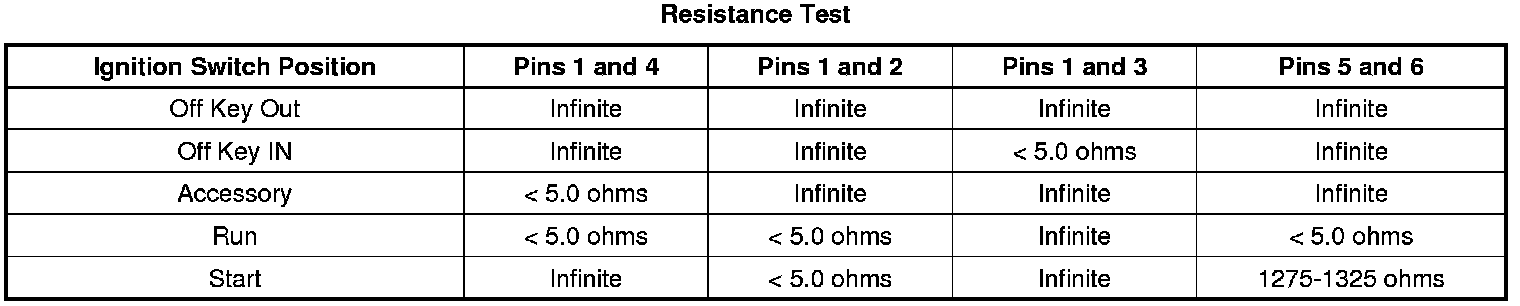 Using the Resistance Test below, verify the resistance between the pins of the ignition switch match the chart below while cycling the key to each switch position listed.