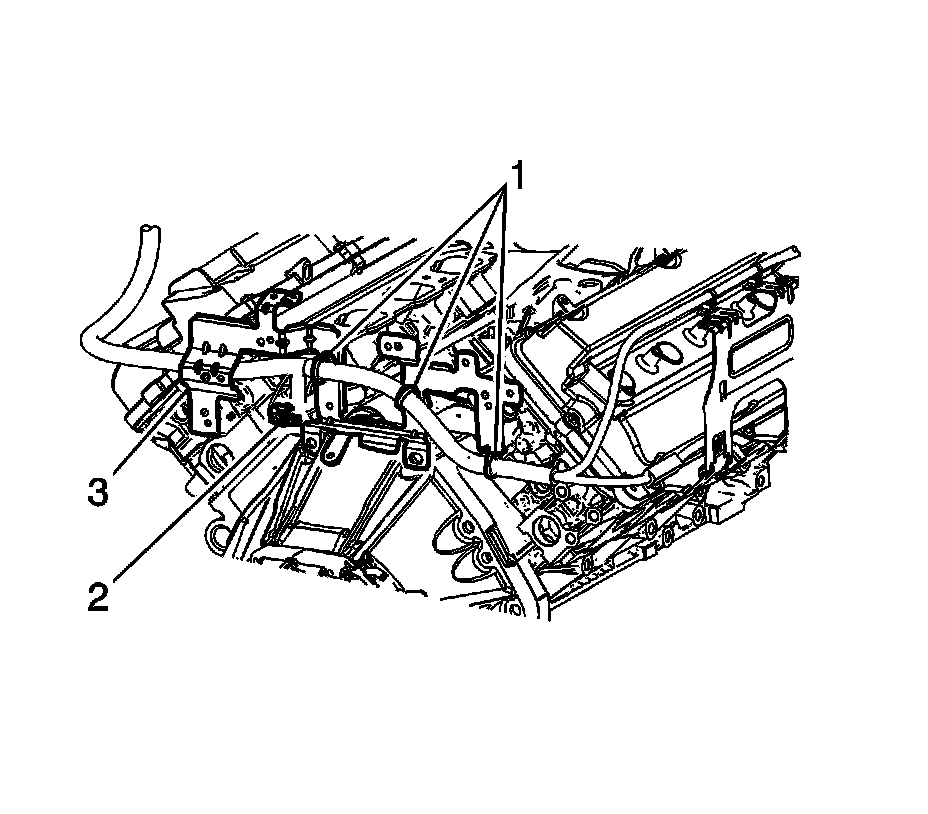 15. Remove the positive battery cable clips (1, 3) from the engine wiring harness bracket.