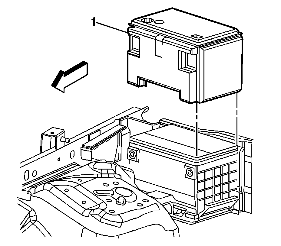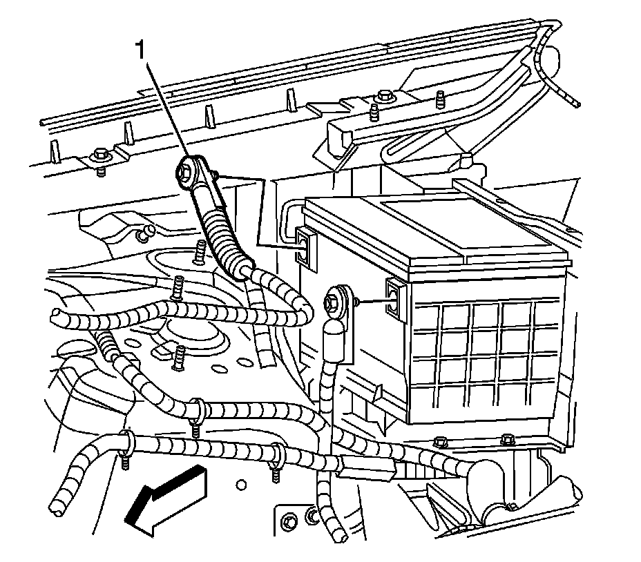 6. Remove the battery hold down retainer bolt (1) and retainer (2).