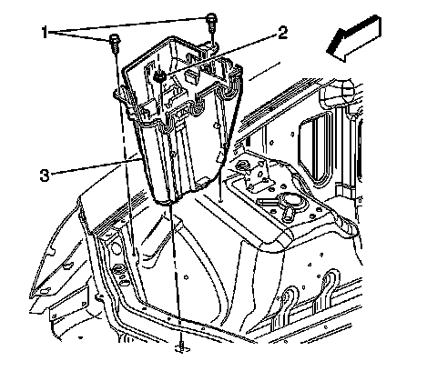 9. Remove the fasteners (1, 2) securing the electrical center (3) to vehicle.