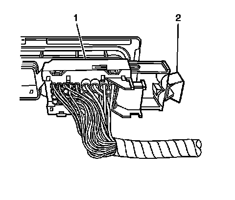 4. Lock the TCM electrical connector securely to the TCM by pushing the retainer (2) toward the electrical connector (1) until fully seated.