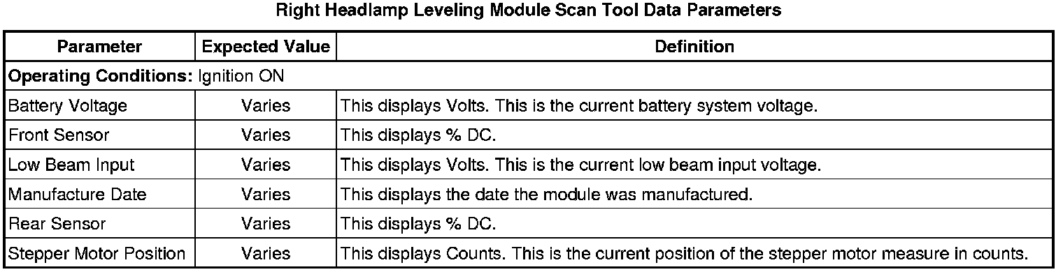 Headlamp Leveling Control Module Scan Tool Information (Right)