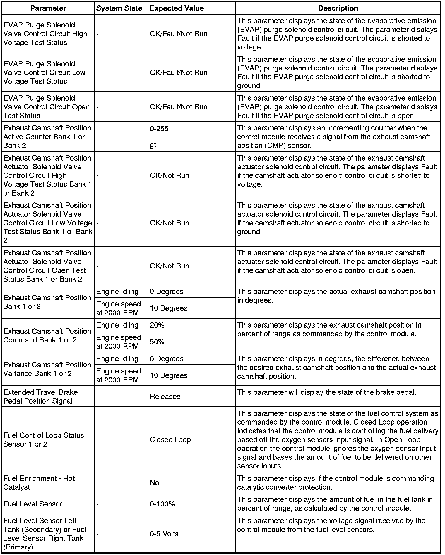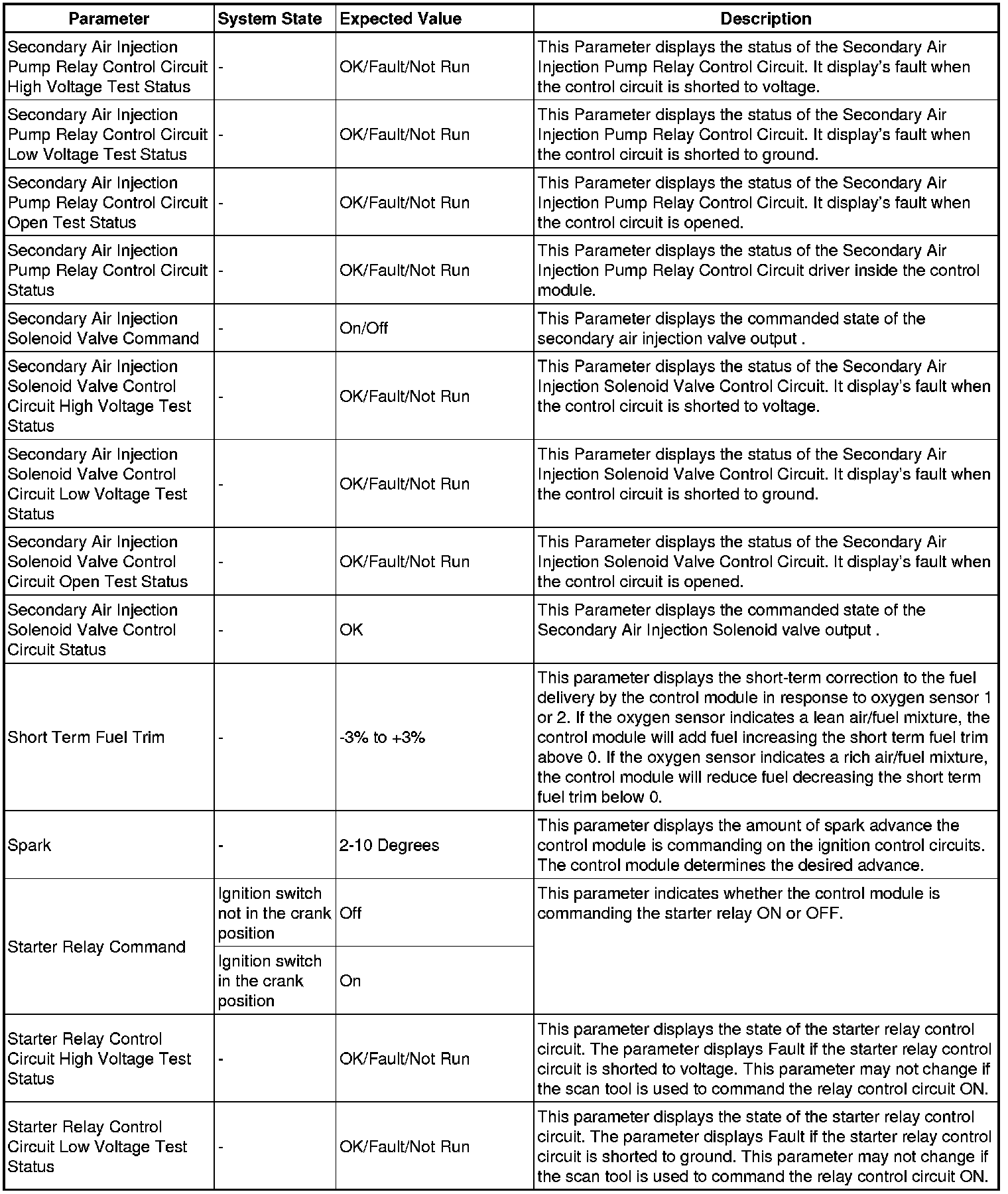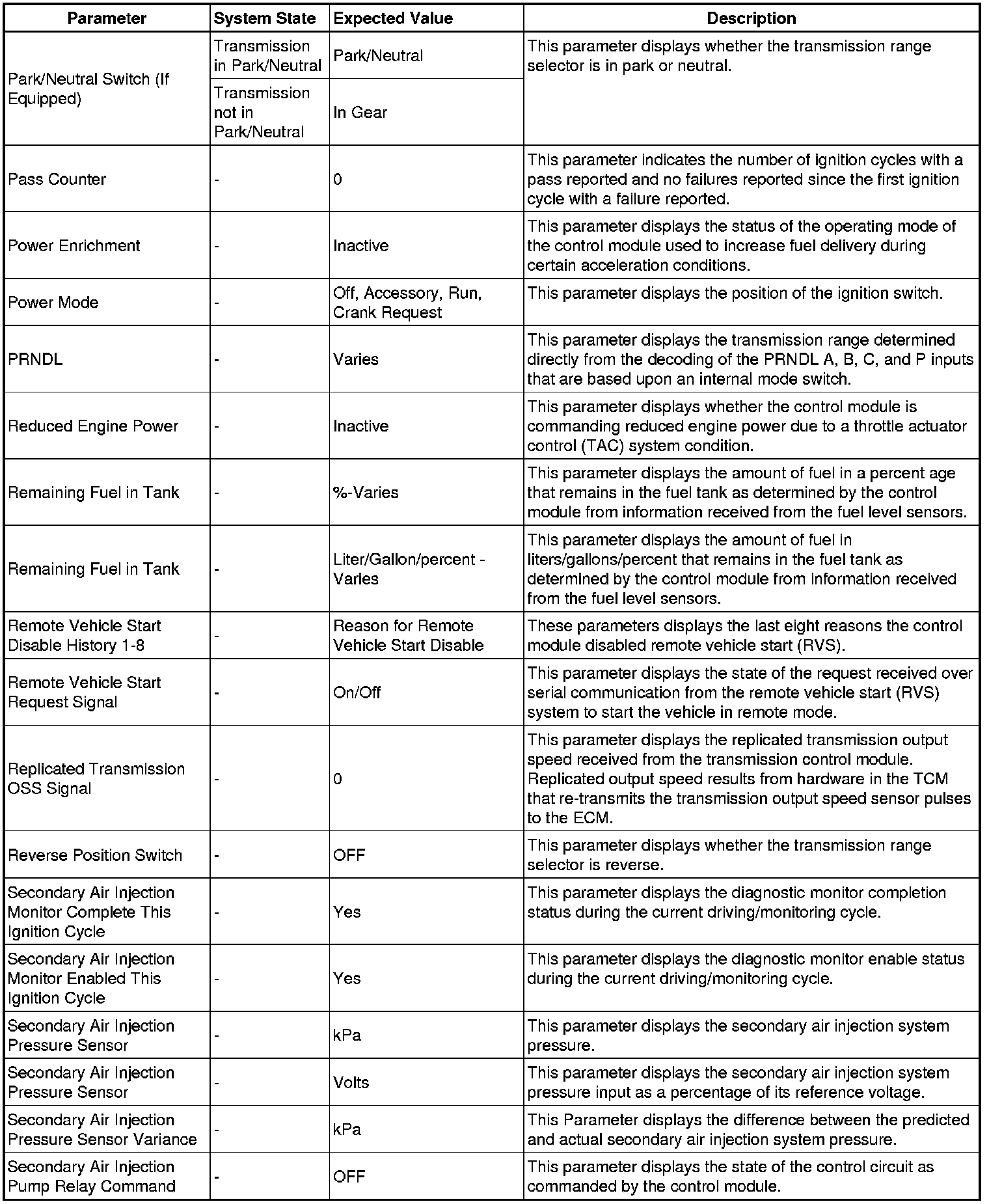 The Engine Control Module Scan Tool Data List contains all engine-related parameters that are available on the scan tool. The list is arranged in alphabetical order. A given parameter may appear in any one of the data lists, and in some cases may appear more than once, or in more than one data list in order to group certain related parameters together.
