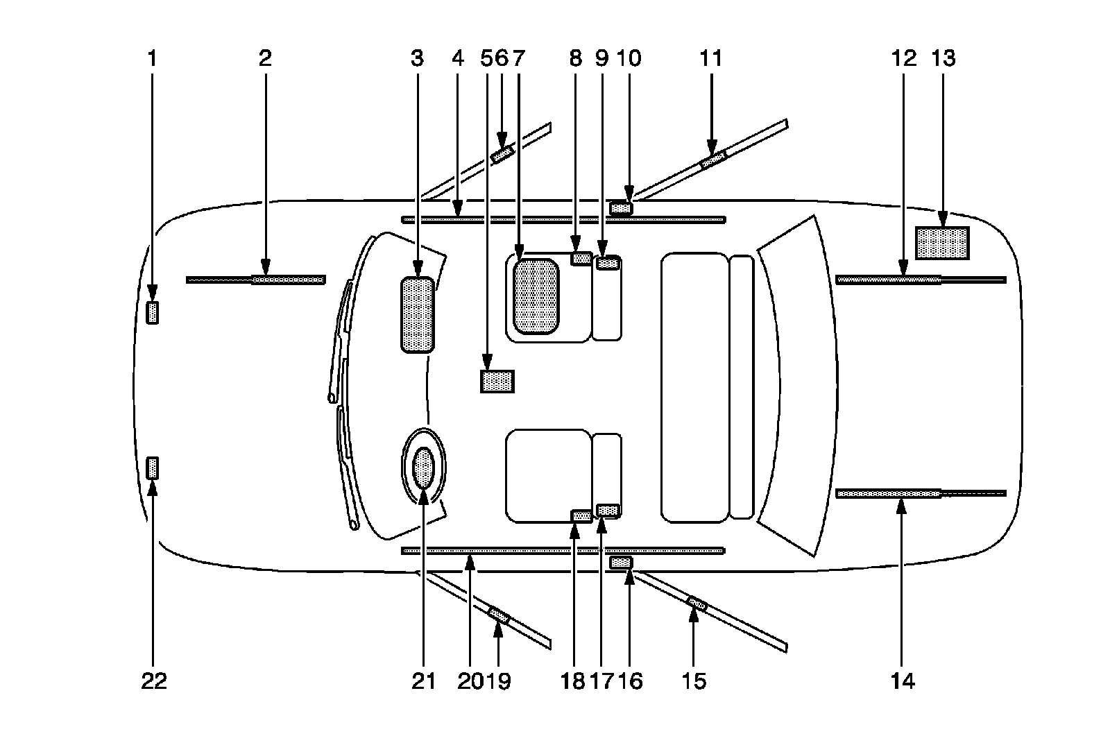 The SIR Identification Views shown below illustrate the approximate location of all SIR components available for the vehicle. This will assist in determining the appropriate SIR Disabling and Enabling for a given service procedure, refer to SIR Disabling and Enabling (Service and Repair).