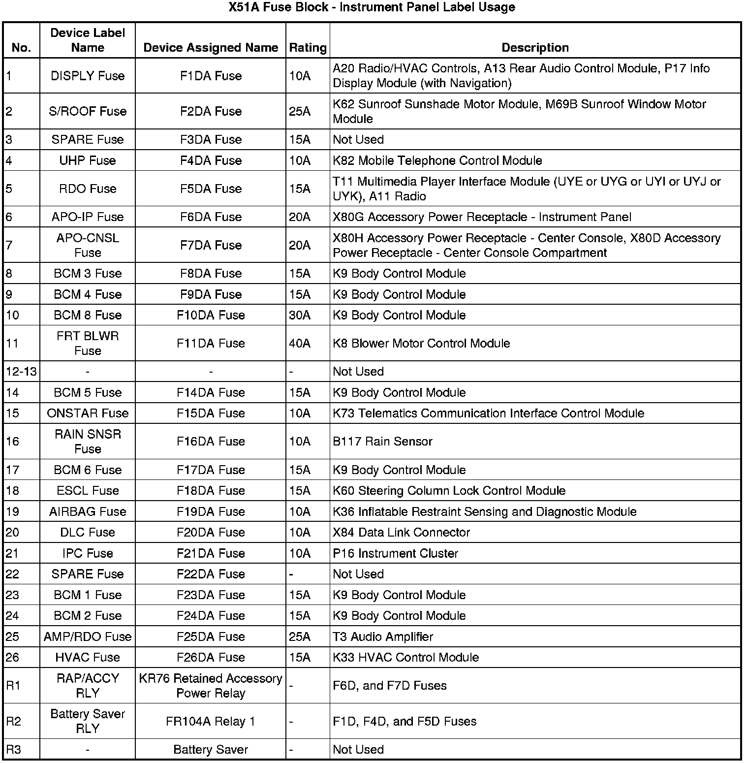 X51A Fuse Block - Instrument Panel Label