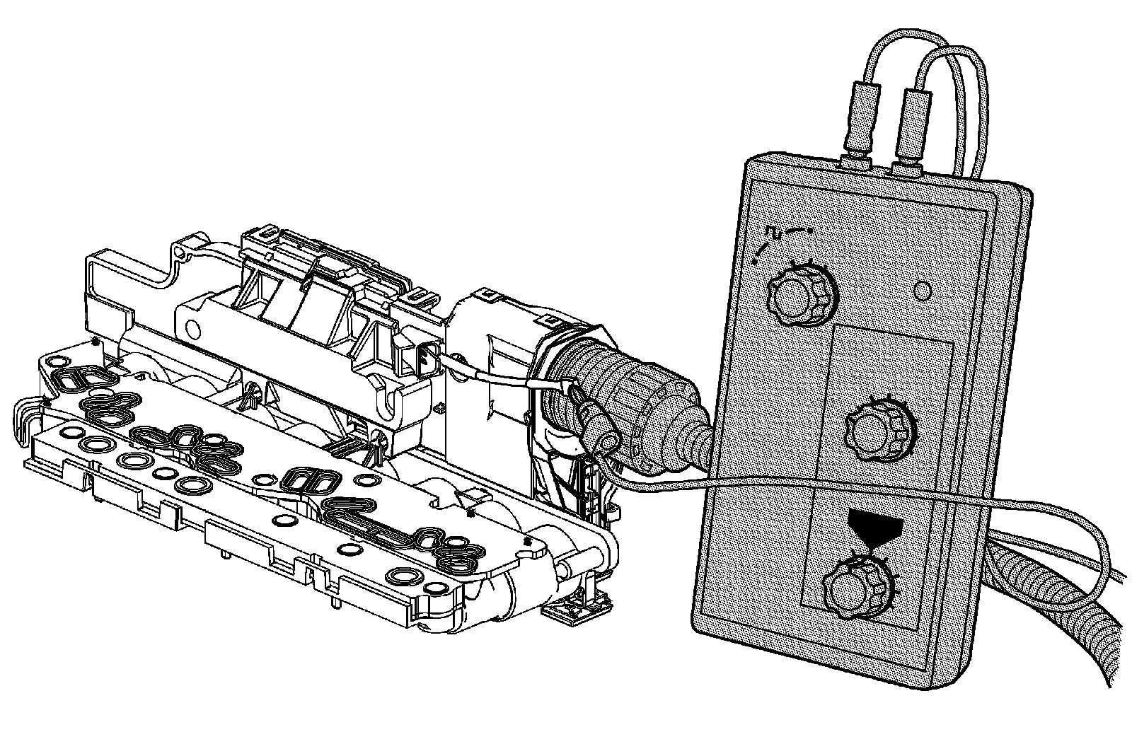 1. Ignition OFF, connect the DT-47825-10 - jumper harness between the vehicle wire harness electrical connector, and the control solenoid valve assembly electrical connector.