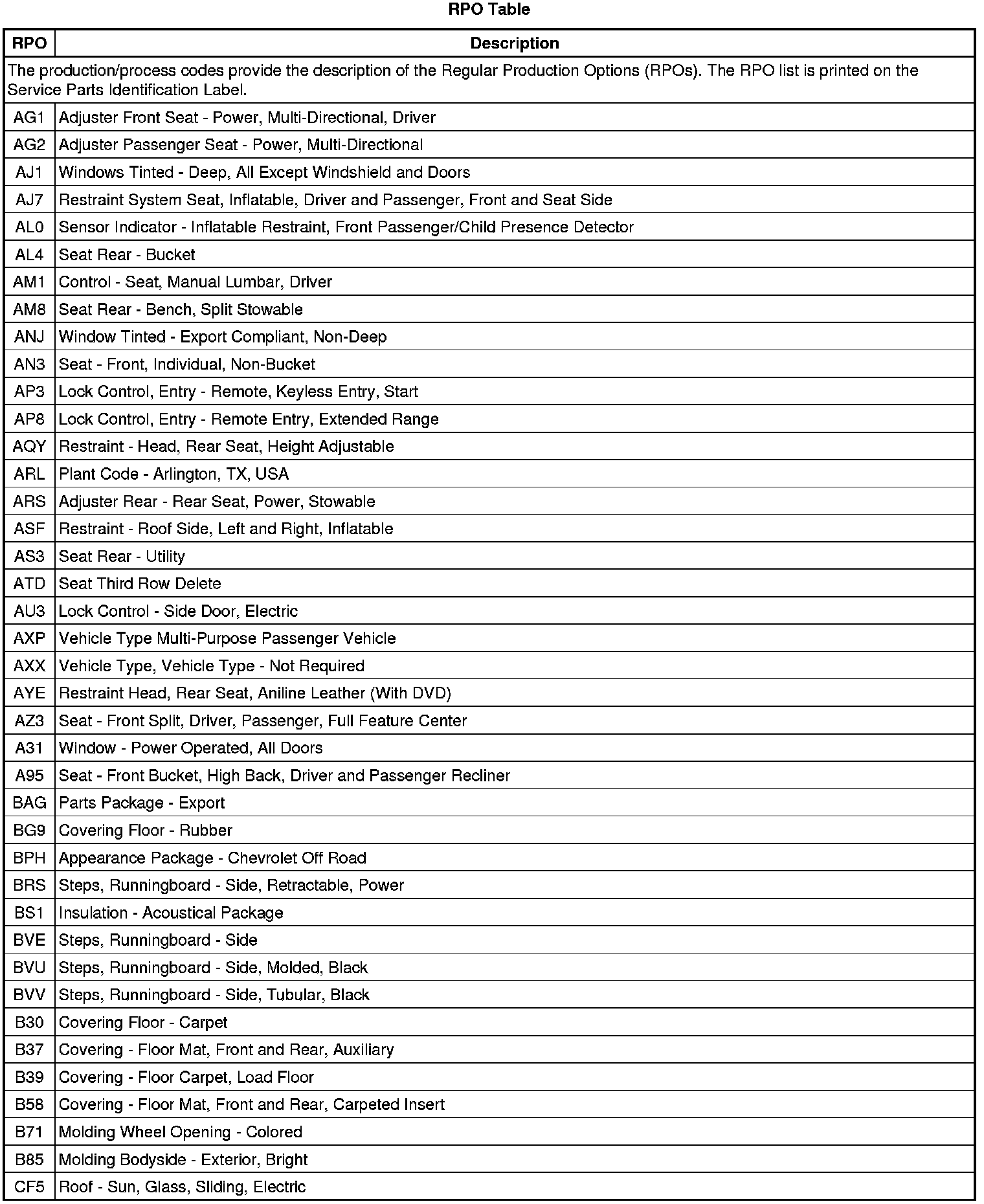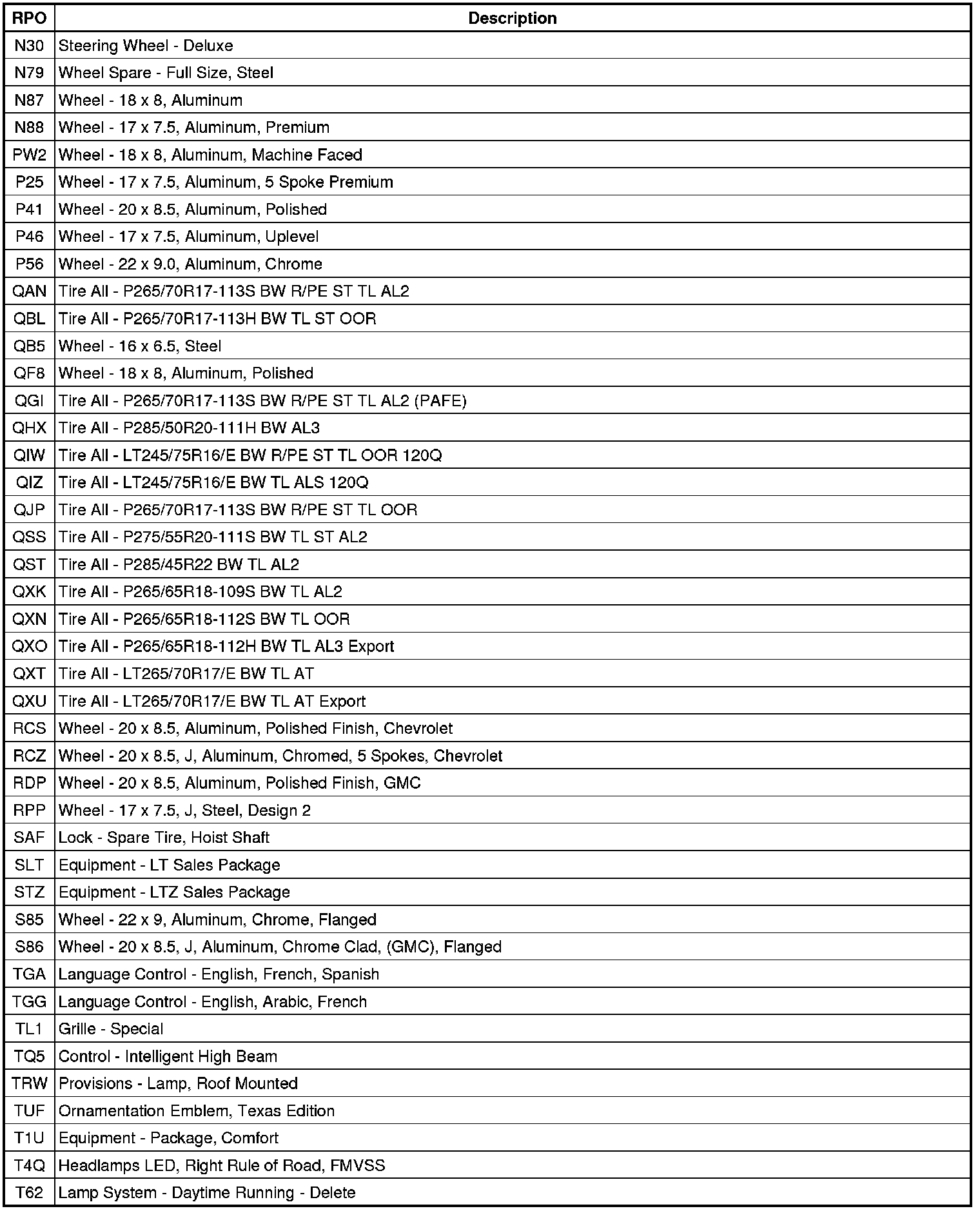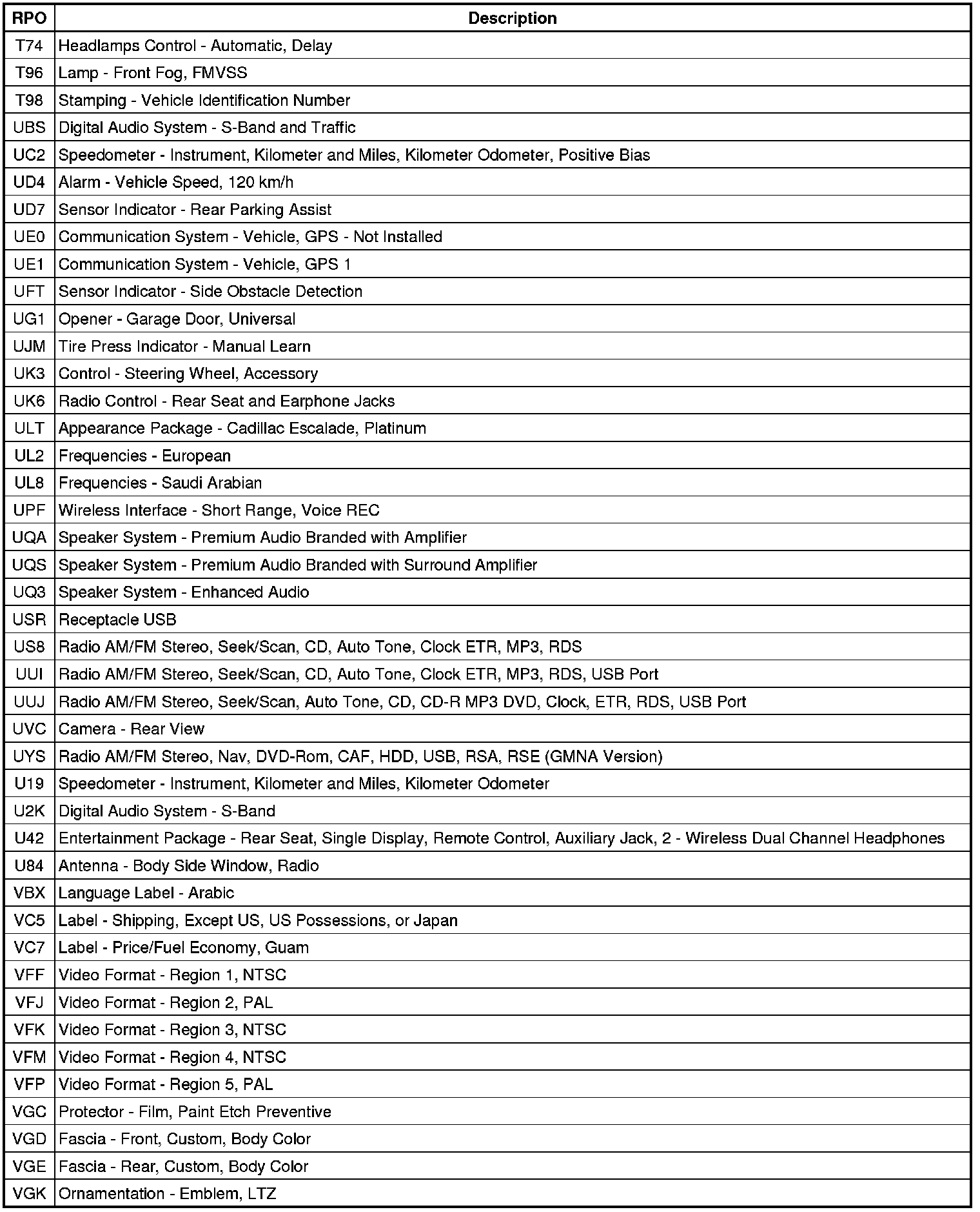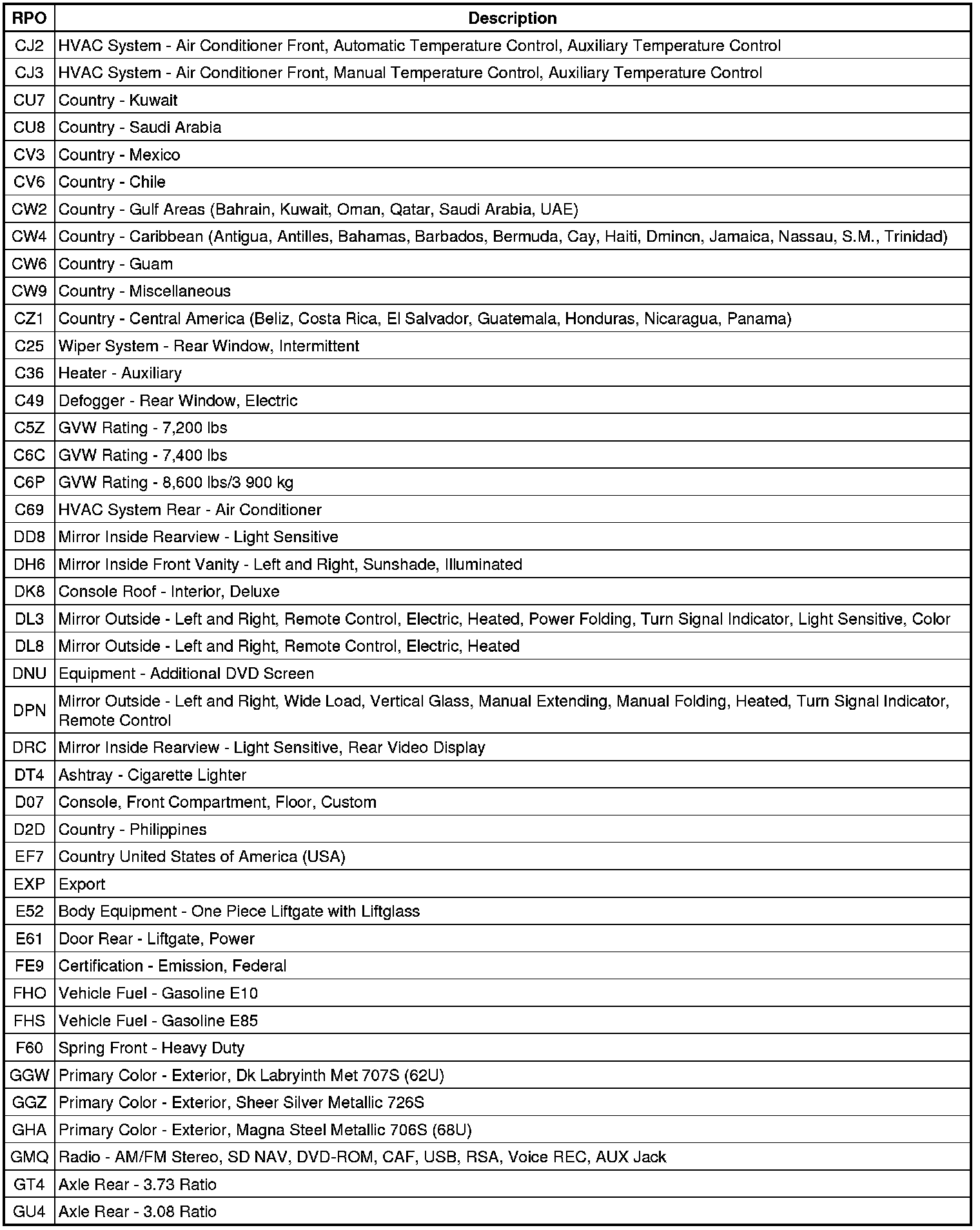 RPO Code List (Escalade ESV, Suburban, and Yukon XL)