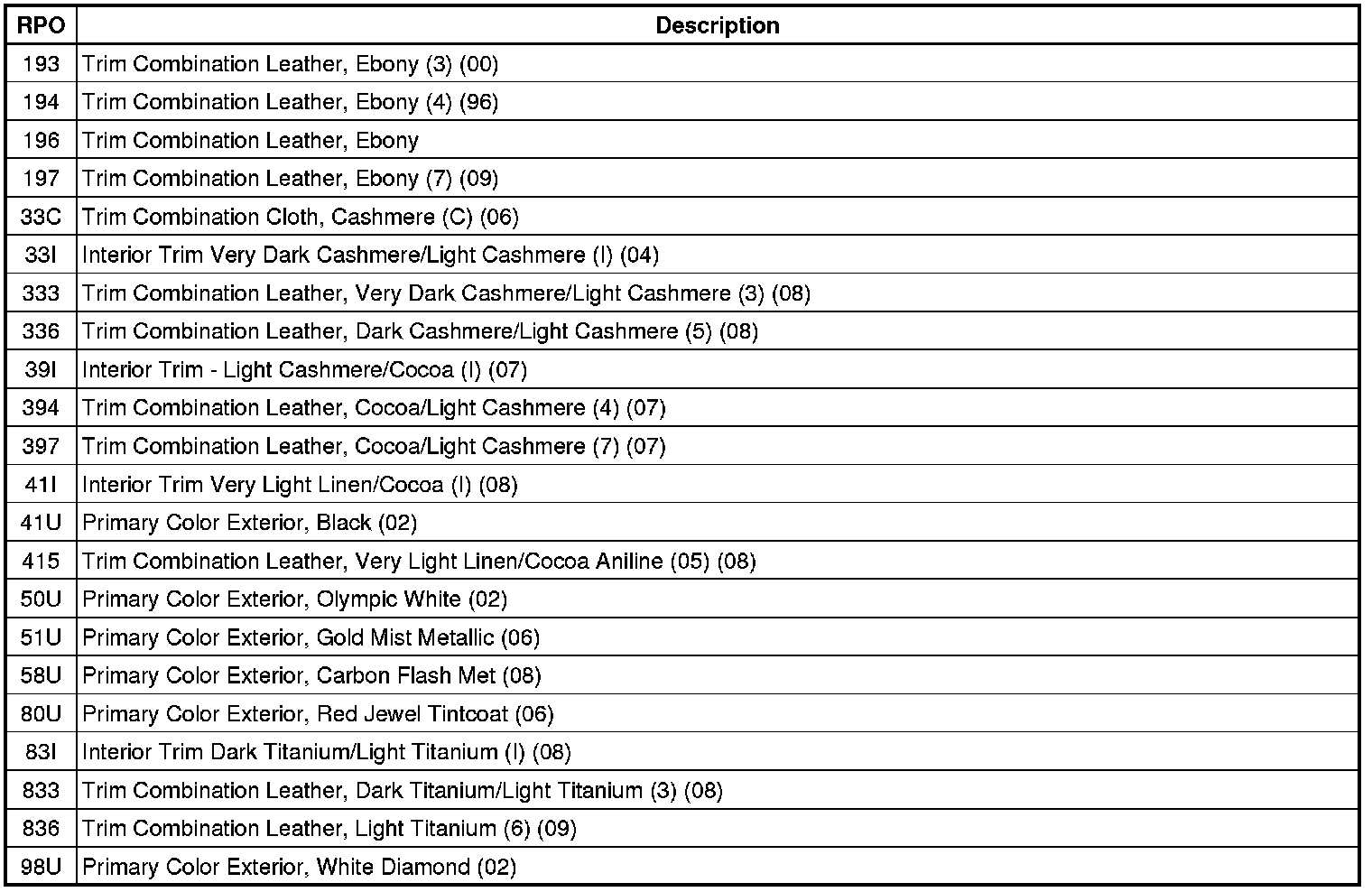 RPO Code List