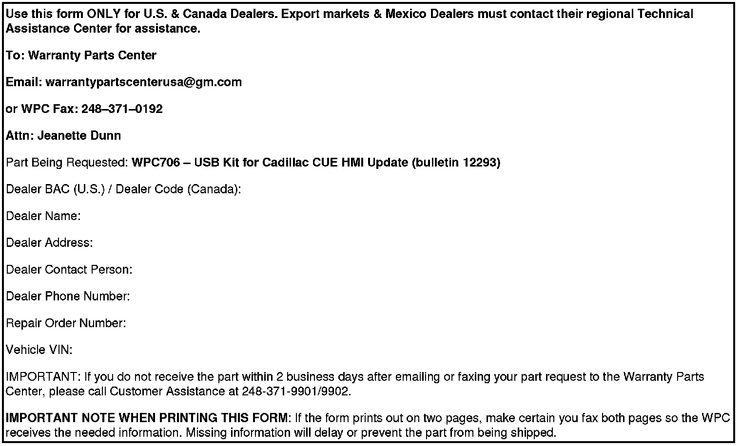 US and Canada: All Cadillac dealers should receive the USB sticks no later than Wednesday, February 27, 2013. These USB sticks will update all involved vehicles. DO NOT GIVE THE USB STICKS TO THE CUSTOMER. Do not order the USB sticks from GMCC&A or the GM Nav Disc Center. If you have not received your USB sticks by February 27, 2013, and you have involved vehicles, the USB sticks can be obtained from the Warranty Parts Center (WPC) using the Parts Request Form found at the back of this bulletin.