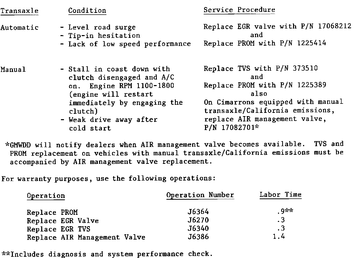 Some early Cimarrons may exhibit one or more of these conditions and may be corrected by performing the service procedure identified in this bulletin.