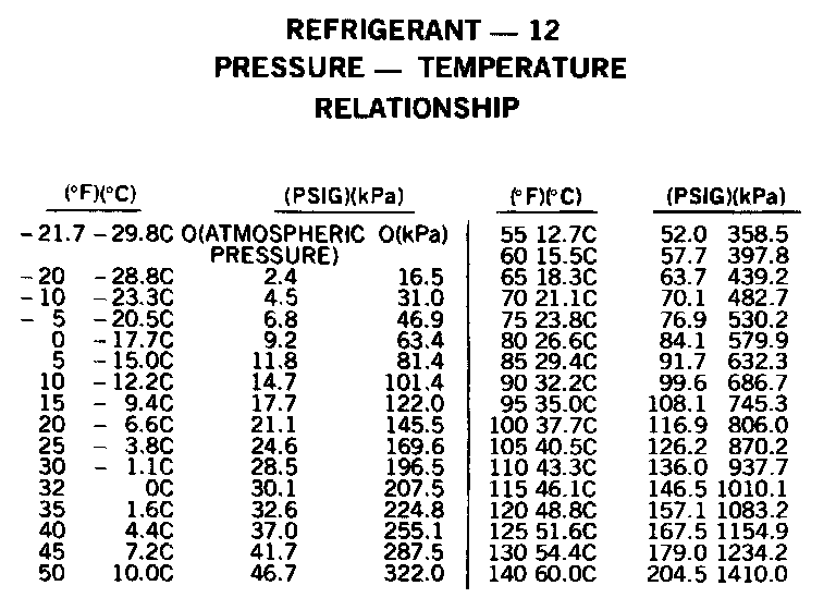 The illustrated table indicates the pressure of Refrigerant-12 at various temperatures. For instance, a drum of Refrigerant at a temperature of 80°F (26.6°C) will have a pressure of 84.1 PSI (579.9 kPa). If it is heated to 125°F (51.6°C), the pressure will increase to 167.5 PSI (1154.9 kPa). It also can be used conversely to determine the temperature at which Refrigerant-12 boils under various pressures. For example, at a pressure of 30.1 PSI (207.5 kPa), Refrigerant-12 boils at 32°F (0°C).