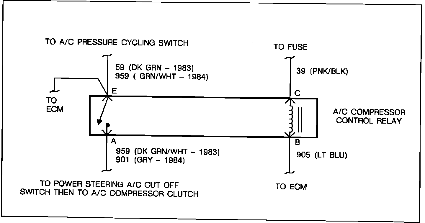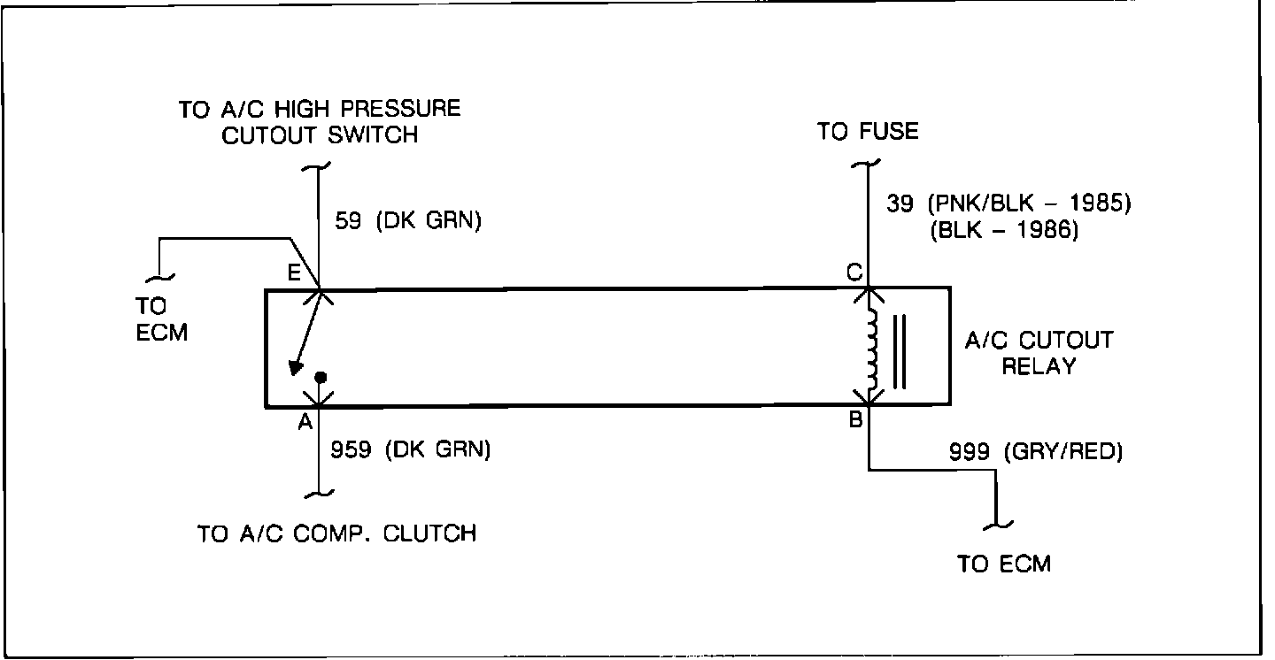 4. Interchange circuit 959/59, pin E (1983, 1985, 1986 dark green, 1984 green/white) and circuit 39, pin C (1983-1985 pink/black, 1986 pink) at the relay connector using terminal removal tool, refer to Figures 1 and 2.