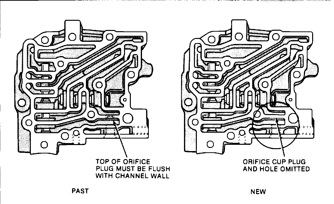 One has an orifice cup plug and the other does not (Figure 1). If the transmission being serviced has the auxiliary valve body with the orifice cup plug, particles of the auxiliary valve body cover gasket may have torn loose. This material may be causing the [1][2]Torque Converter Clutch apply valve to bind and/or plug the converter release orifice in the control valve body spacer plate. If this is found, disassemble the auxiliary valve body and thoroughly clean. Also, be sure to remove any gasket particles in the valve body spacer plate converter release orifice hole and replace the auxiliary valve body cover gasket, P/N 8653947 (refer to Serviceman Bulletin 84-70, Group 7, Number 101).