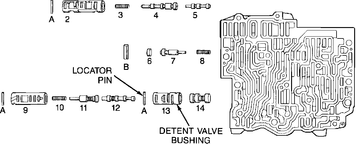 To correct this condition, reroute the valve body, orient the bushing correctly in its bore and install a locator pin (P/N 8628400). (The locator slot in the Lo-1st Detent Valve Bushing is not illustrated in the figure due to its orientation.)