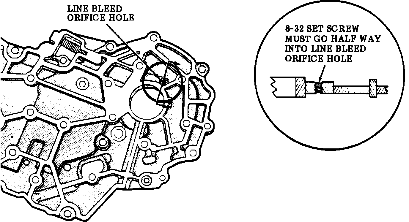3. Steps 1 and 2 should, in most cases, eliminate delayed engagement conditions. However, if the condition persists after following this procedure, it may be necessary to proceed to step 4 and install service package P/N 8635967. This includes a #8-32 set screw to be used for plugging the line bleed orifice in the case cover and a new design pressure regulator valve bushing. When installing this kit, it is essential to use both parts to ensure proper transmission operation. It is not necessary to remove the check valve installed in step 2.
