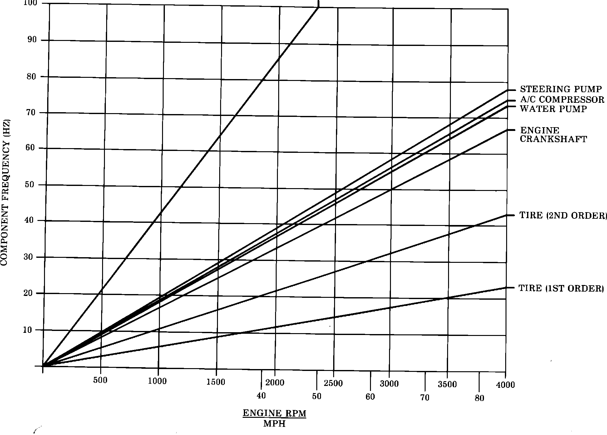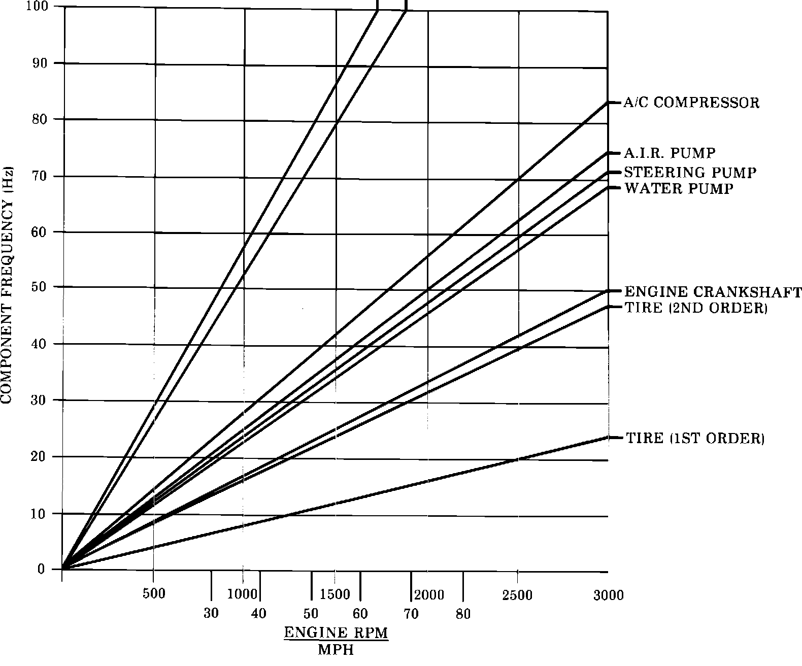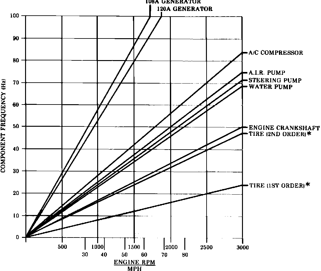 FIGURE 7 - ROTATIONAL ORDER CHART1985 "J"-CAR WITH 2.8L V-6 ENGINE AND AUTOMATIC TRANSAXLE IN 3RD GEAR WITH TCC ENGAGED: