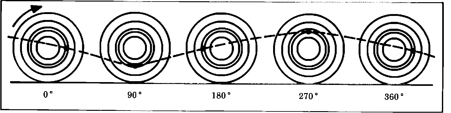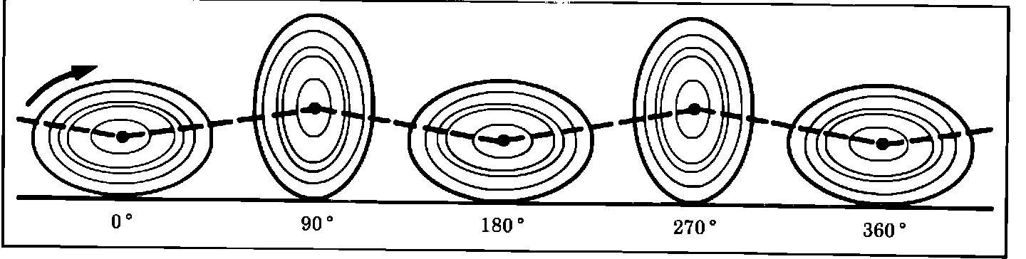 As noted on the chart, some components may induce more than one vibration at a given speed (i.e., tires, identified by the * in Figure 2). These multiple vibrations are referred to as the order of a vibration. The order of a vibration refers to the number of disturbances created by one rotation of a component. For example, a tire with one heavy spot will produce one disturbance each rotation--a 1st order vibration (Figure 3). An oval-shaped tire will produce two disturbances each rotation--a 2nd order vibration (Figure 4).