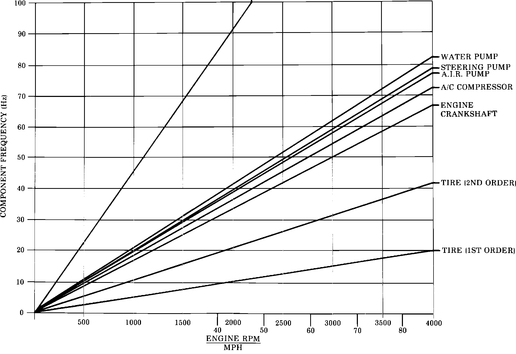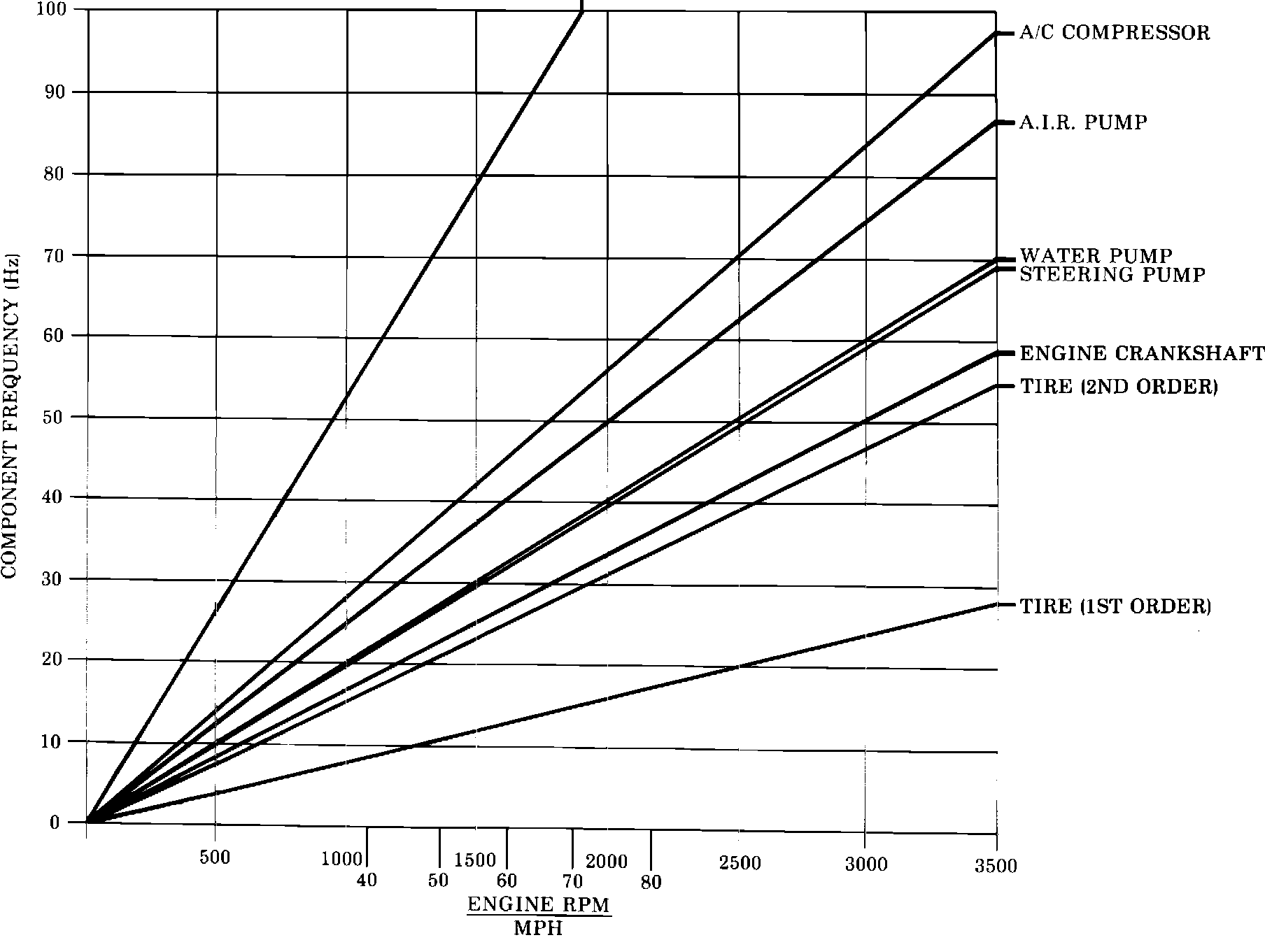 Example: A 1985 C-car with a 440-T4 transaxle is travelling at 55 MPH, and the 13 Hz reeds are vibrating (Figure 1). The Rotational Order chart for 1985 C-cars (Figure 2) indicates, by following across the chart on the 13 Hz line to where it intersects the 55 MPH vertical line, that there is a 1st order tire vibration.