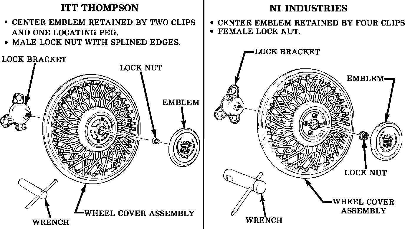 1985 Devilles and Fleetwoods may be equipped with locking wire wheel covers produced by either NI Industries or ITT Thompson. The information contained in Figure 1 may be used to distinguish between wheel covers produced by the two sources.