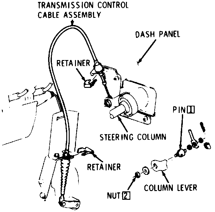 2. Set transmission lever in neutral detent, then move pin 1 to give "free pin" fit in column lever and torque attaching nut two to 20 ft. lbs.