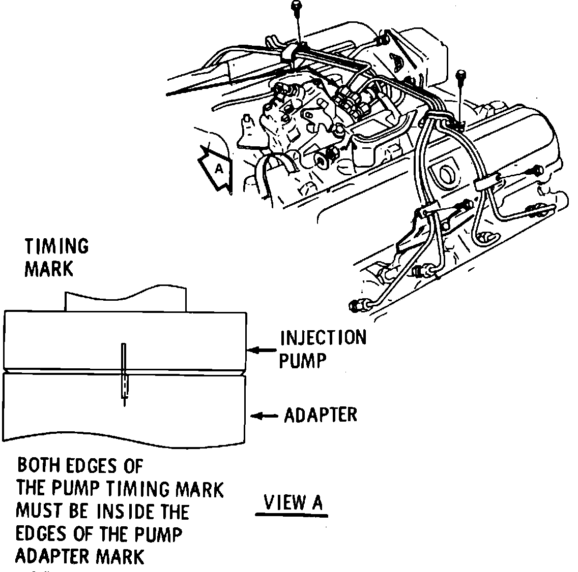 Certain engine malfunctions can cause inaccurate timing readings. Engine malfunctions should be corrected before adjusting pump timing. The marks on the pump and pump adapter will normally be aligned within .030 inch.