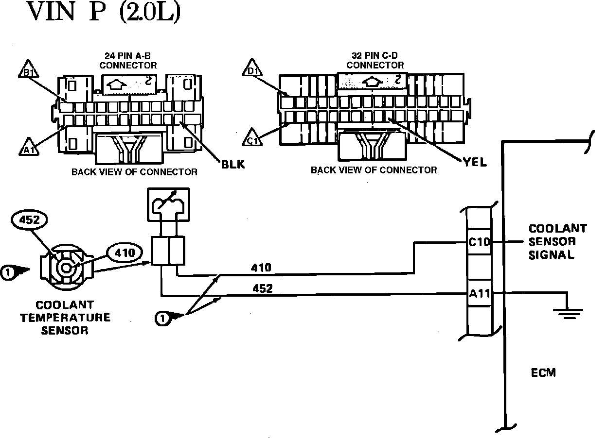 As the engine warms, the sensor resistance becomes less, and the voltage drops. At normal engine operating temperature the voltage will measure about 1 to 1.5 volts at the ECM terminal C10.