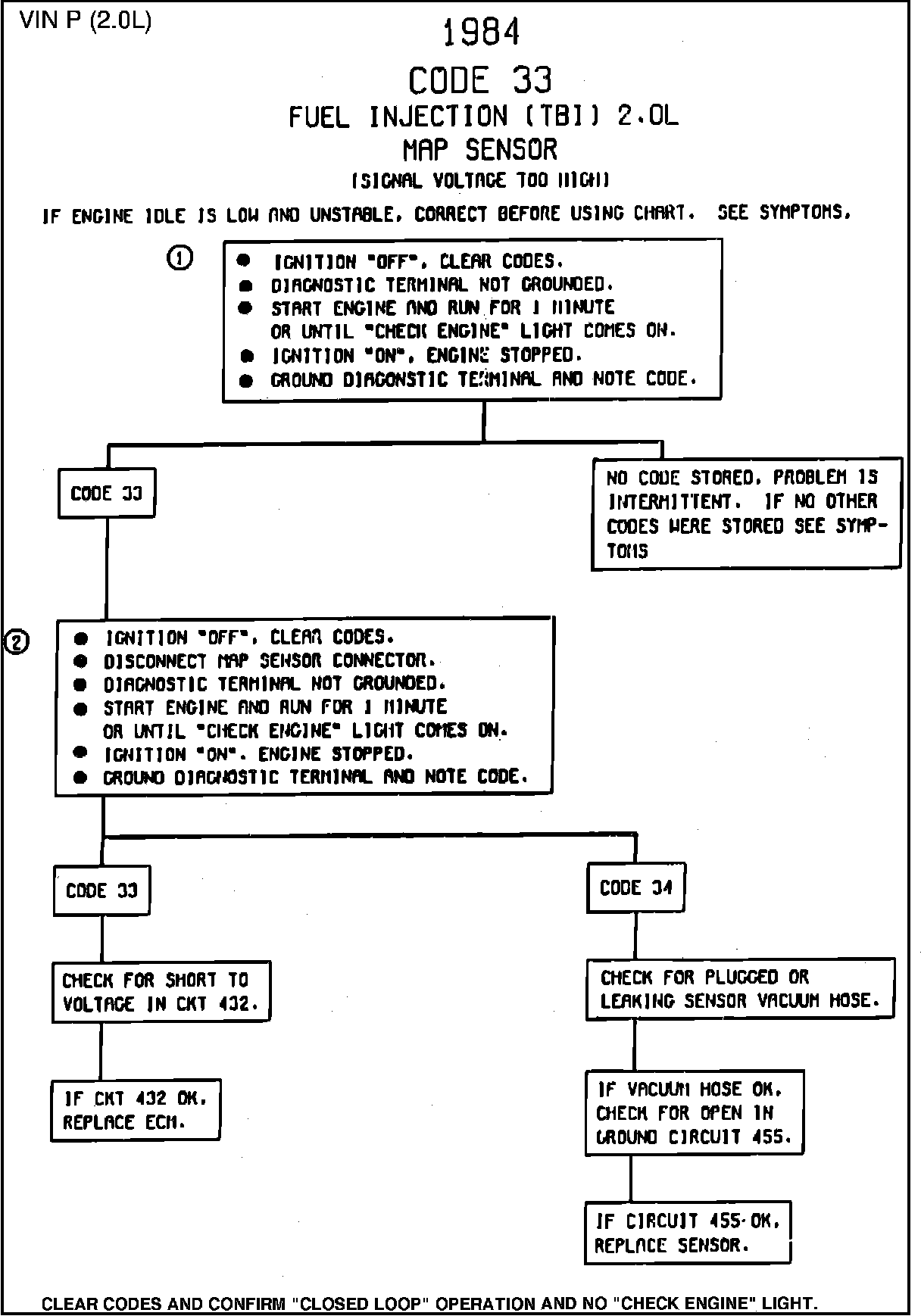Engine misfire or a low and unstable idle may set Code 33. Disconnect MAP sensor and system will go into backup mode. If the misfire or idle condition remains, see Symptoms