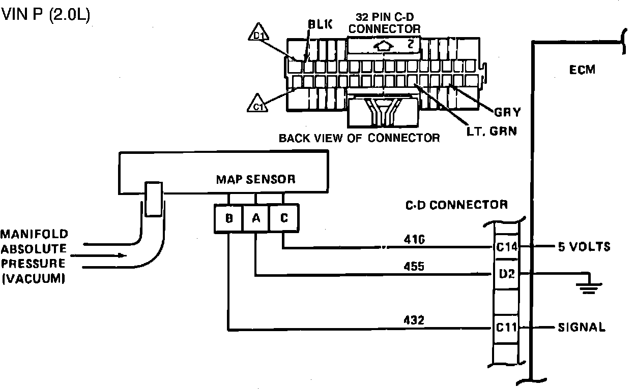 The Manifold Absolute Pressure sensor (MAP) responds to changes in manifold pressure (vacuum). The ECM receives this information as a signal voltage that will vary from about 1-1/2 volts at idle to 4-4.5 volts at wide open throttle.
