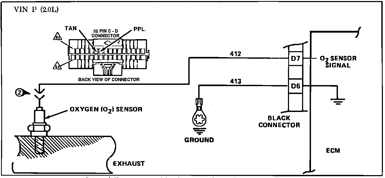 The ECM supplies a voltage of about .45 volt between terminals "D7" and "D6". (If measured with a 10 megohm digital voltmeter, this may read as low as .32 volts.) The O2 sensor varies the voltage within a range of about 1 volt if the exhaust is rich, down through about .10 volt if exhaust is lean.
